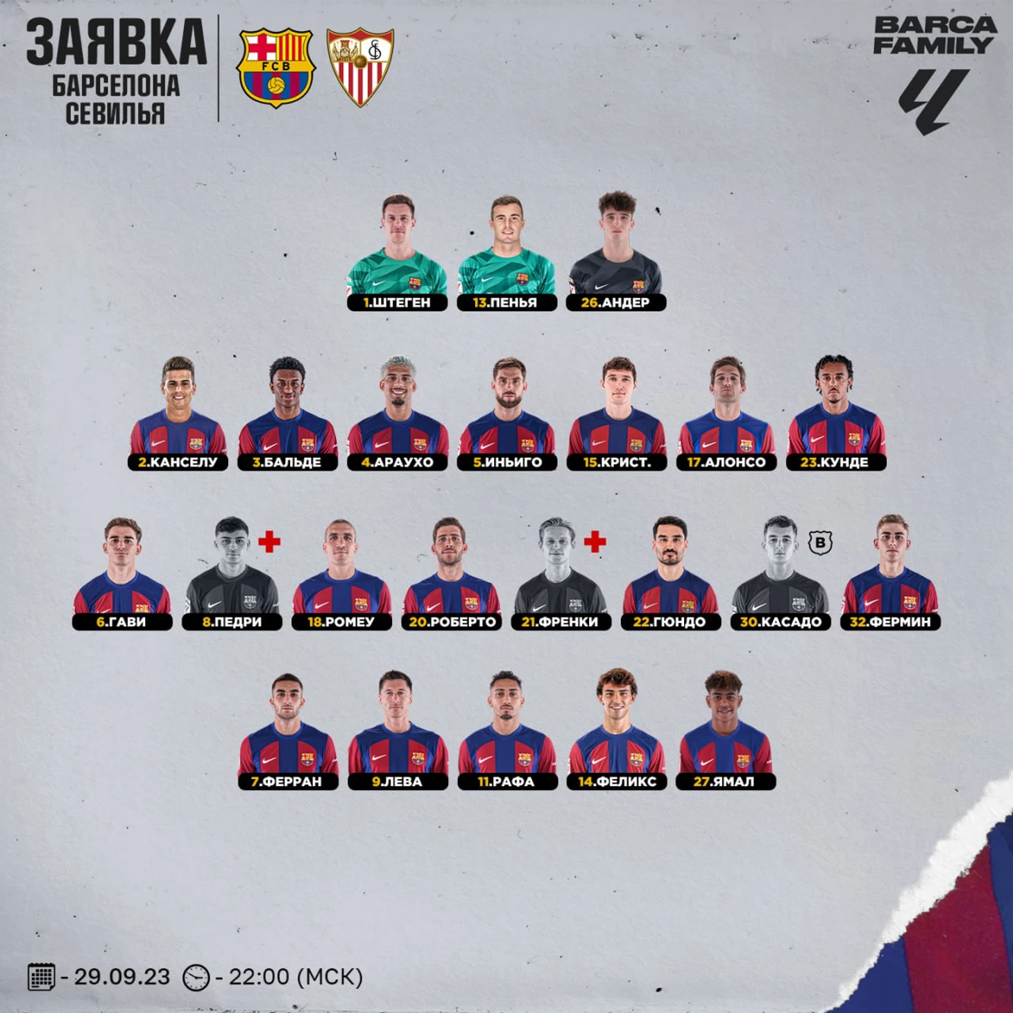 В заявке, по причине травм, отсутствуют Педри и Френки де Йонг. Остальные все в сторю и готовы. Хави: «Мы анализируем физический аспект. У европейских команд много травмированных игроков. Мы сыграли вничью с «Мальоркой» не из-за ротации. Ротация необходима».