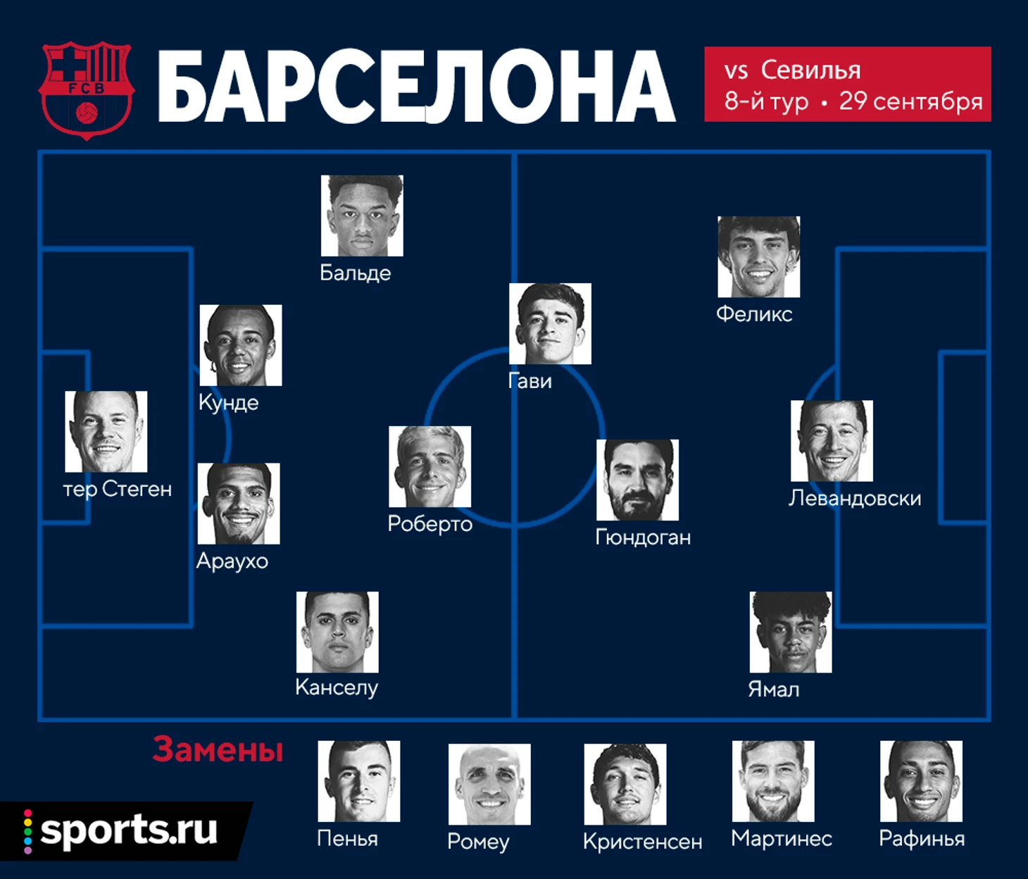 Возвращение Ямаля и Роберто: стартовый состав «Барселоны» на матч против «Севильи»