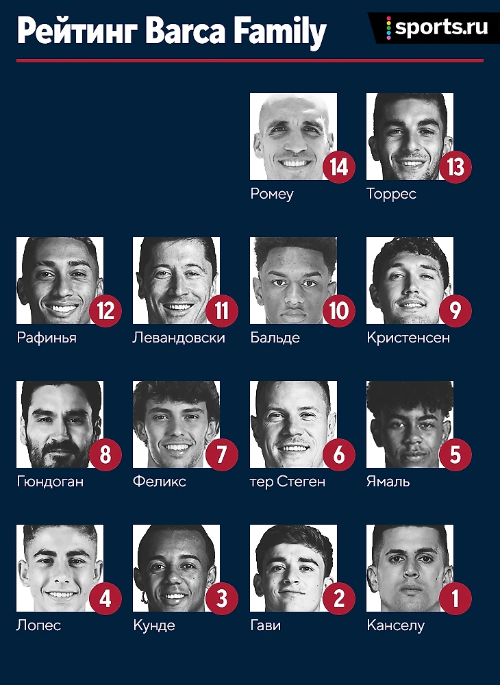 8. Илкай Гюндоган – на этот матч стал опорником и неплохо справился со своей ролью. 7. Жоау Феликс – ко второму тайму стал по спортивному злым и был близок к голу, но сегодня немного не повезло. 6. Марк Андре тер Стеген – 3 спасения и 92% точных передач. Вратарь не позволил сопернику достичь своих целей. 5. Ламин Ямаль – немного потерялся в первом тайме, однако преобразился во втором и стал прямым соучастником первого и единственного гола каталонцев. 4. Фермин Лопес – его выход был незапланированным, однако его выход очень положительно повлиял на матч. Отлично играл с мячом и без, а в одном из моментов был крайне близок к голу.