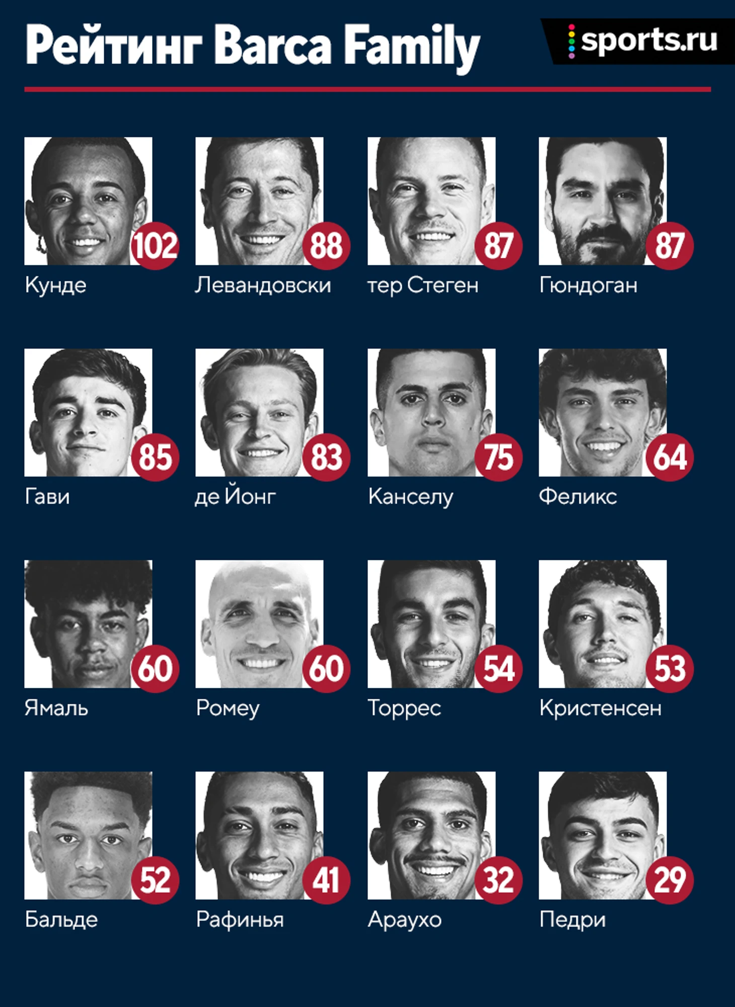 После каждого матча «Барселоны» мы формируем свой рейтинг футболистов располагая их в зависимости от их вклада в результат матча: Рейтинг после матча с «Осасуной» 2:1 Рейтинг после матча с «Бетисом» 5:0 Рейтинг после матча с «Антверпеном» 5:0 Рейтинг после матча с «Сельтой» 3:2 Рейтинг после матча с «Мальоркой» 2:2 Рейтинг после матча с «Севильей 1:0 За первое место игрок получается количество баллов равное последнему месту. И наоборот, игрок с последнего места получает только 1 балл, с предпоследнего — 2 и т.д. В конце каждого месяца мы суммируем эти баллы и формируем общий рейтинг. При такой модели очень хорошо виден вклад каждого футболиста на дистанции. Важно не просто сыграть хорошо один матч, а быть полезным на протяжении всего месяца: регулярно выходить на поле и приносить результат. В сентябре «Барселона» провела 6 матчей, в которых одержала 5 побед и 1 раз сыграла вничью. Забито 18 мячей, а пропущено всего 5. Результат более, чем достойный, однако единственная ничья лишила «Барсу» лидерства в Ла Лиге. Так что давайте теперь перейдем к индивидуальному рейтингу футболистов.