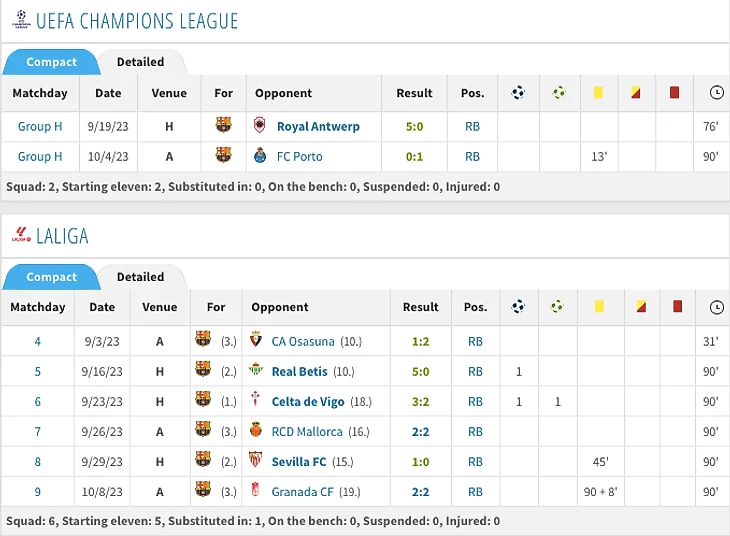 Не стоит забывать, что Ла Лига слегка изменила рекомендации для арбитров и теперь к матчам стали добавлять намного больше времени. Сейчас средняя продолжительность матча в Чемпионате Испании составляет более 100 минут игрового времени. vs «Гранада»: совокупно добавлено 12 минут vs «Порту»: совокупно добавлено 8 минут vs «Севильи»: совокупно добавлено 7 минут vs «Мальорка»: совокупно добавлено 13 минут vs «Сельта»: совокупно добавлено 10 минут vs «Антверпен»: совокупно добавлено 7 минут vs «Бетис»: совокупно добавлено 5 минут