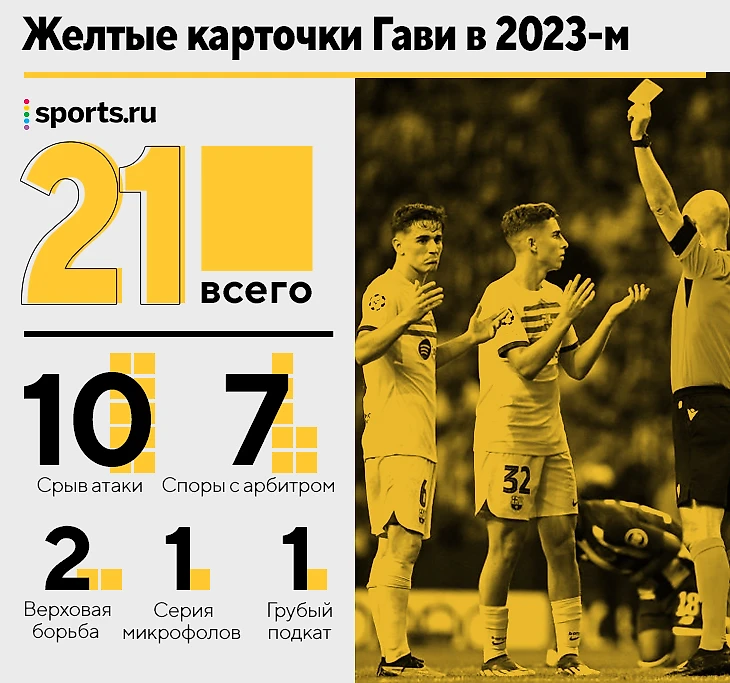 Всего за 2023-й у Гави накопилась 21 желтая карточка. Никто в «Барсе» не нарушает правила чаще, но почти всегда нарушения – тактические.