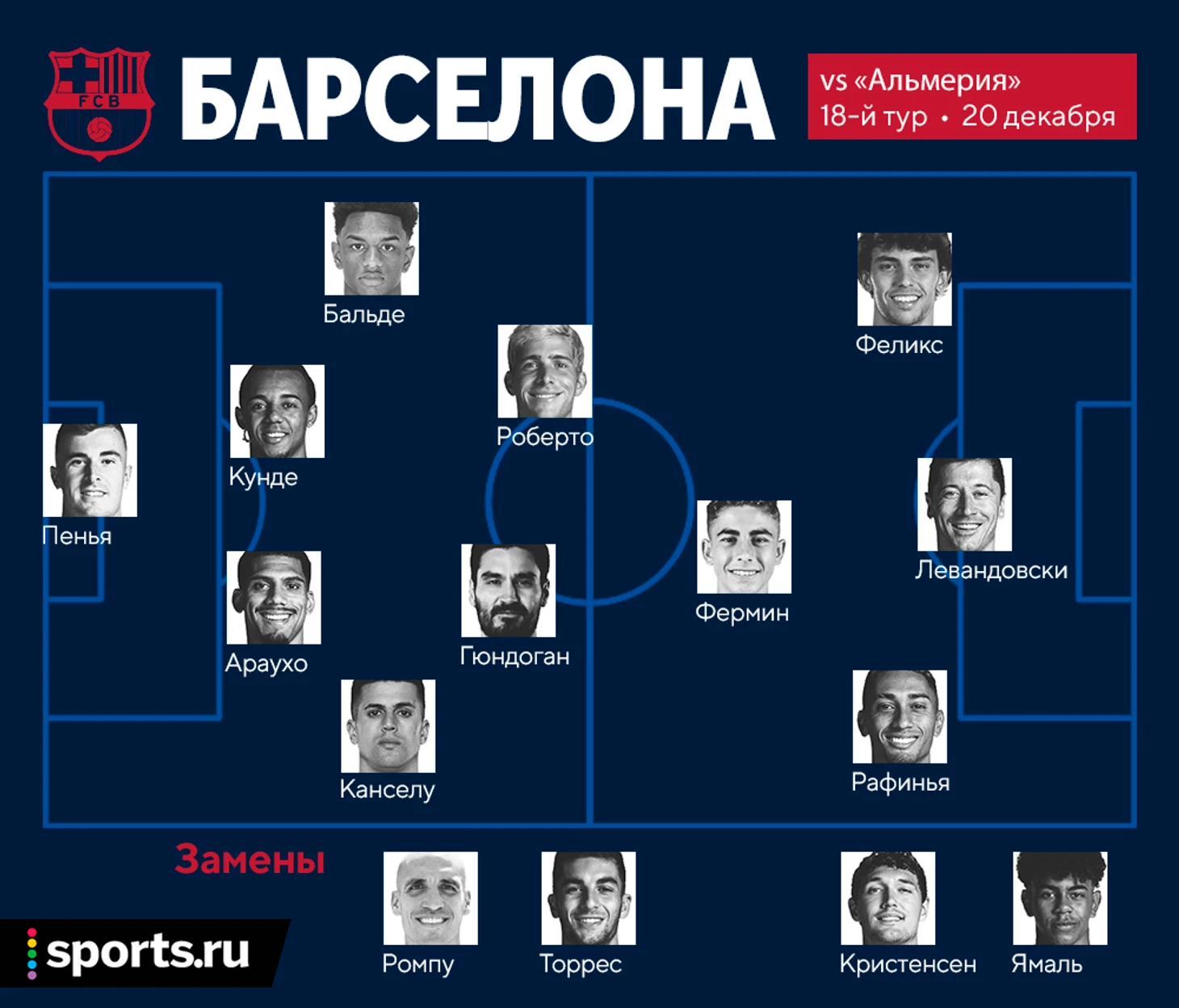 Ферран Торрес и Ламин Ямаль уже давно заслуживают свой шанс выйти в старте, однако большие изменения в центре поля могут вынудить Хави сократить количество экспериментов и вернуться к более привычной вариации. Рафинья и Феликс снова должны выходить на поле вместе с Робертом Левандовски, а остальные будут ждать своего шанса во втором тайме.