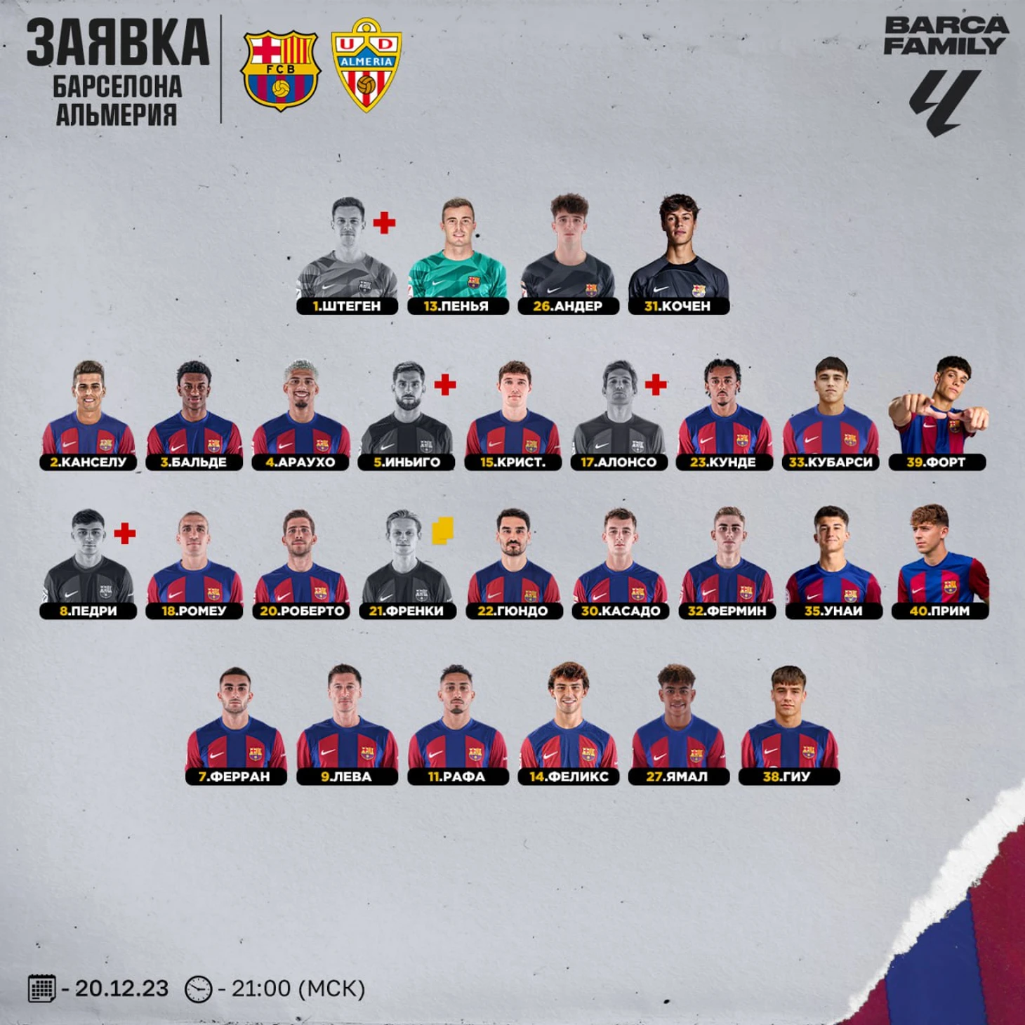 В заявку на матч не попали: Френки де Йонг – перебор карточек Гави – травма до конца сезона Маркос Алонсо – травма Педри – мышечный дискомфорт Иньиго Мартинес – травма