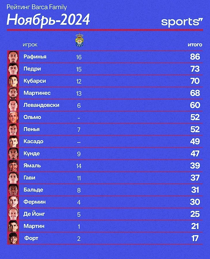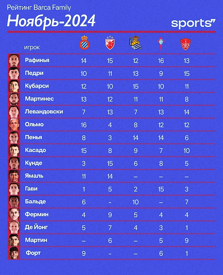 В ноябре «Барселона» провела пять матчей: 3 победы, 1 ничья, 2 поражения. Разница мячей 14-8. Подопечные Ханси Флика выдали свой худший месяц в сезоне. Но если в лиге чемпионов свое положение удалось улучшить, то вот в Ла Лиге команда растеряла все преимущество и теперь «Реал Мадрид» может выйти в лидеры.