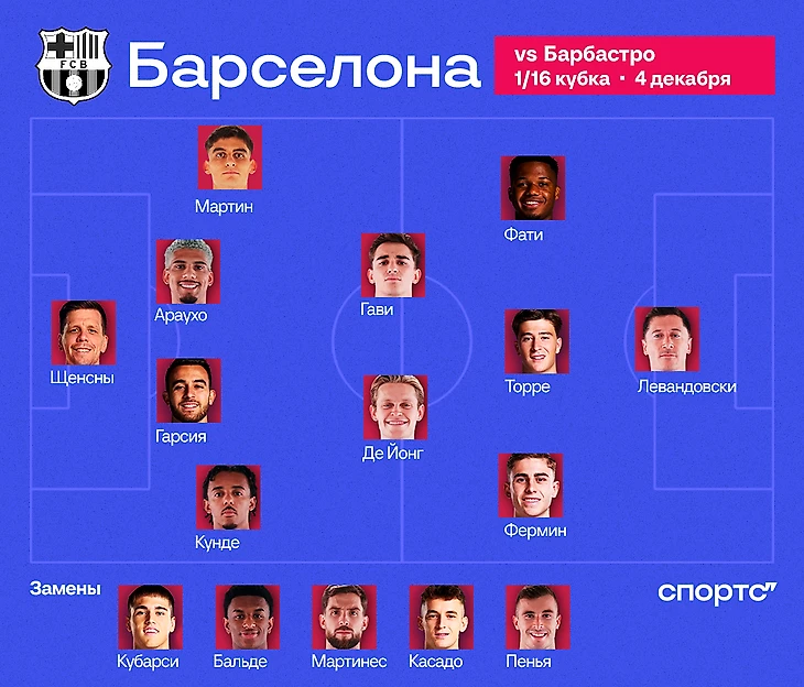 Дани Ольмо все еще не зарегистрирован, поэтому остался вне заявки, как и Пау Виктор. Но и без него выбор внушительный. Пора в стартовом составе появляться Френки де Йонгу, а Гави может попробовать себя с ним в паре. Пабло Торре давно заслужил шанс и всегда классно смотрится в таких матчах.