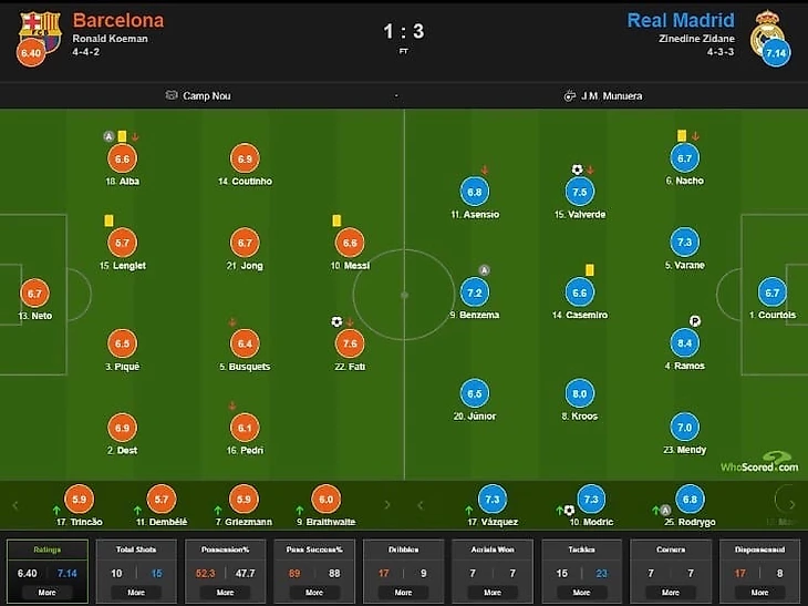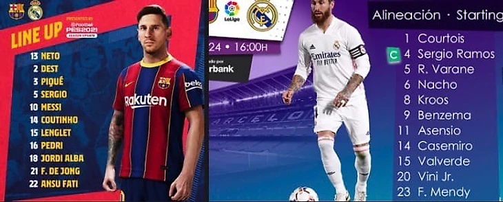 Стартовые составы особо не удивили. Куман предпочел, чтобы Гризманн остался на скамейке и дал шанс Педри проявить себя. Дебют удался, не только у Педри, но и у Деста, Нето и Фати, который забил единственный гол за Барселону. В стане Мадрида сюрпризов по составу не было. 4-3-3 с проверенным центром поля Кроос, Каземиро, Вальверде. Зидан выпустил на поле более-менее здоровых футболистов. Вернулся и Серхио Рамос, который стал для фанатов Блауграны после этого матча, наверное самым ненавистным футболистом.