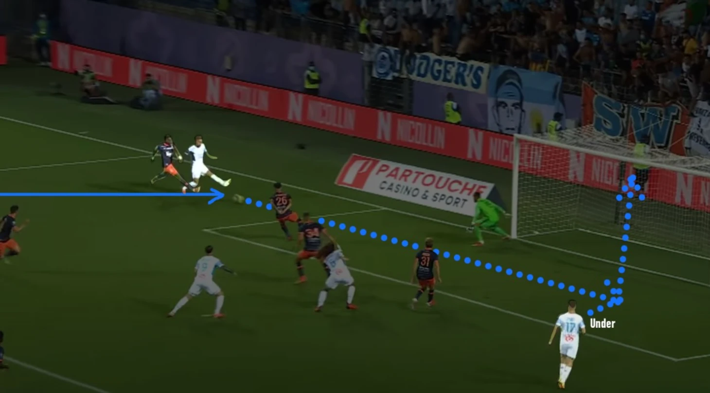 Однако ему понадобилось менее четырех матчей, чтобы доказать, что он очень хорошо владеет обеими ногами. Это может быть связано с его периодом тренировок в Ла Масии, где Конрад любил играть слабой ногой и прижиматься к боковой линии, чтобы улучшить свою игру в целом. Давайте посмотрим на матч первого тура против «Монпелье», где Конраду противостоял Жуниор Самбия. В прошлом сезоне Самбиа выиграл 54% противоборств на поле и является очень быстрым правым защитником.