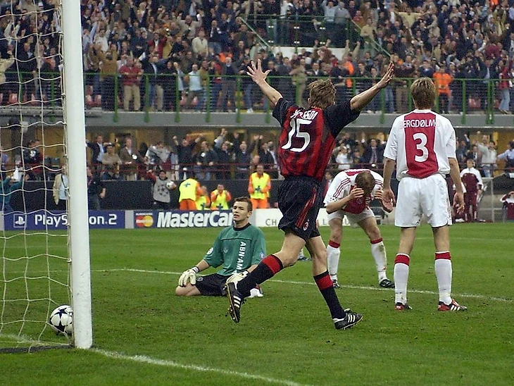 Первое противостояние Рональда и Карло случилось в сезоне 2002/03. «Аякс» Кумана с Ибрагимовичем, Снейдером, Ван дер Вартом и, ха-ха, Де Йонгом, бодался с грозным «Миланом». В Амстердаме команды голов не забили, а вот на «Джузеппе Меацца» будущий триумфатор чуть не вылетел из турнира. Команда Анчелотти дважды вела в счете, дважды «Аяксиды» сравнивали и за счет правила гостевого гола проходили бы дальше, но пропустили роковой гол уже в дополнительное время — 3:2.