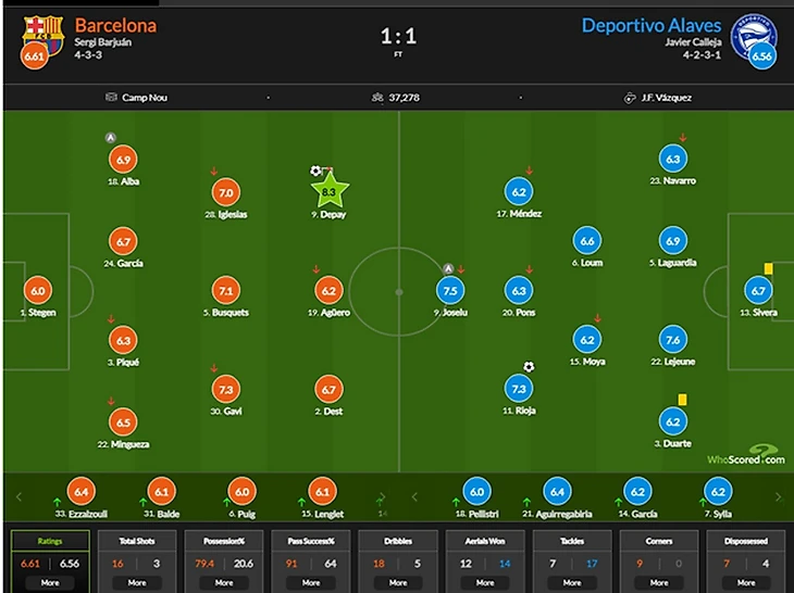 «Барселона»: тер Штеген — Альба, Эрик Гарсия, Пике (Лангле, 70'), Мингеса (Эз Абде, 81') — Гави (Рики Пуч, 71'), Бускетс, Нико Гонсалес (Бальде, 81') — Дест, Депай, Агуэро (Коутиньо, 40')