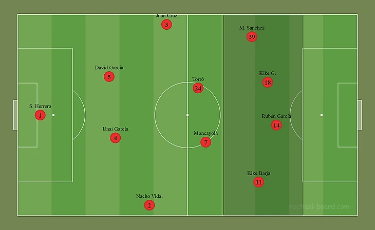 «Осасуна» привычно строила свои атаки либо через фланговые подачи, либо через длинные вертикальные пасы с целью зацепиться за мяч и выиграть подбор. Для этого при начале атаки игроки располагались по схеме 4-2-4. Задача атакующей четвёрки заключалась в том, чтобы цепляться за эти мячи, а дальше, в идеальном сценарии для памплонцев, кто-то из партнёров должен был подобрать мяч и развить атаку.