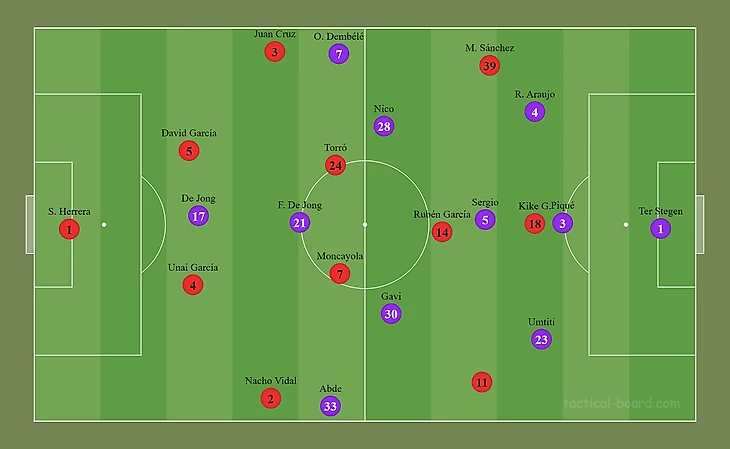 Роли в центре распределялись следующим образом: Бускетс играл опорника, Гави слева, Нико справа и Френки на вершине. Ситуативно футболисты могли меняться своими позициями, но базово это выглядело именно таким образом.
