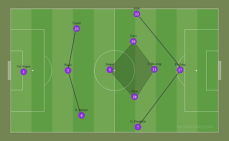 Абде и Дембеле отвечали за создание ширины атаки, располагаясь на краях поля. При Xavi этот аспект чрезвычайно важен, так как «позиционная игра» или «игра позиций», культивируемая новым главным тренером, подразумевает манипуляции с размерами поля для оказания наибольшего давления на противника.