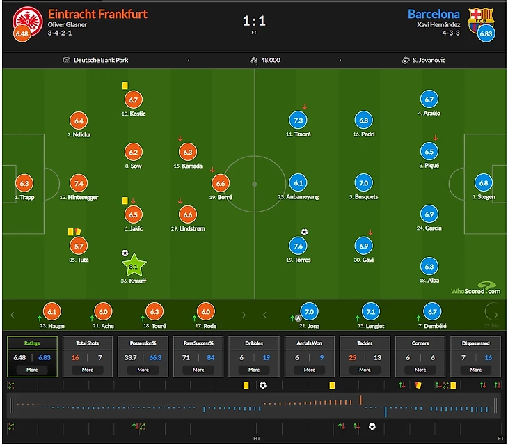 По сравнению с победной игрой против «Севильи» в минувшие выходные, Хави, автор барселонской сказки «Невозможное – возможно», вывел в главные роли три новых персонажа: на поле в старте вышли быстроногий великан Адама Траоре (зря), кудесник Гави (оправдал ожидания) и воин-защитник Гарсия (не зря). К первой встрече против героев франкфуртских легенд все было готово.