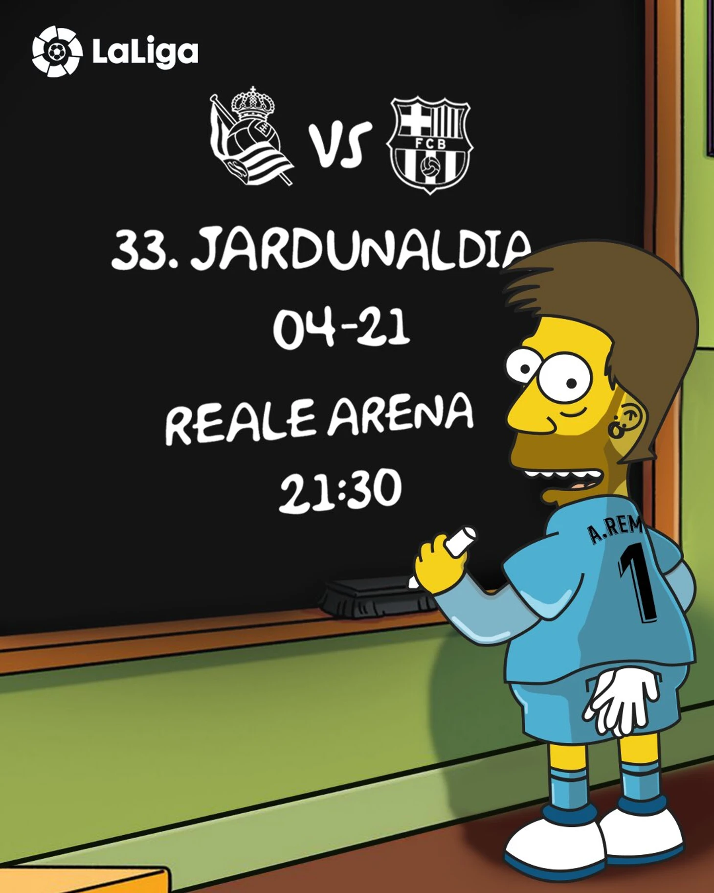 Баски не дают забыть о ситуации на «Камп Ноу» недельной давности. «Реал Сосьедад» традиционно размещает перед игрой небольшое послание сопернику в заблокированной на территории РФ социальной сети. В этот раз вратарь команды Ремиро в роли Барта Симпсона анонсирует дату и место матча на школьной доске, а отсылающая к мультсериалу картинка сопровождается текстом
