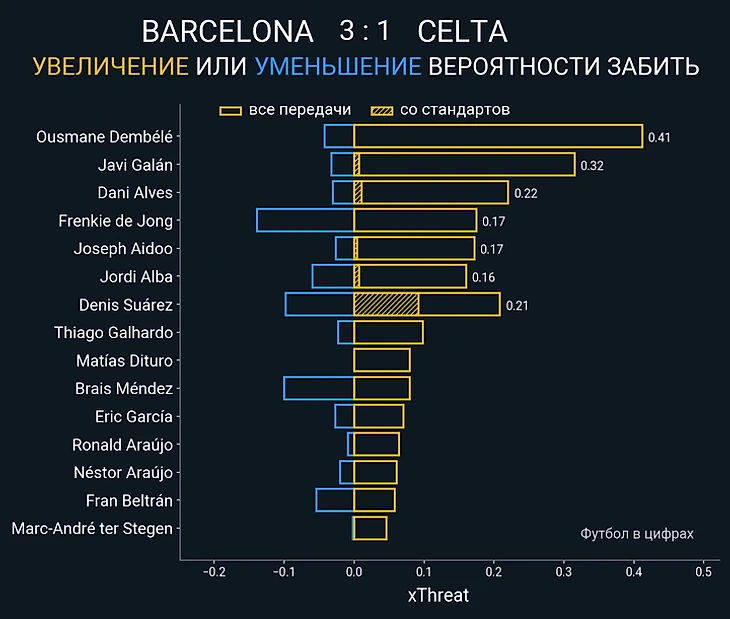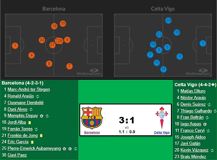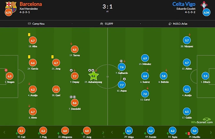 В матче с «Сельтой» Френки был одним из лучших футболистов на поле по целому ряду показателей: первый по касаниям мяча (96), второй по перехватам (2) и прогрессивным пасам (7), третий по прессинг-действиям (19), четвёртый в матче по обостряющим передачам, после Дембеле, Галана и Алвеса. И это далеко не все его заслуги. Хотя Мемфис, Усман и Пьер-Эмерик сделали итоговый счёт на табло, но «сердцем» команды был именно голландский полузащитник. А вот кто провалил встречу, так это Торрес – играл на ограниченном участке поля и был практически полностью незаметен. Ферран здорово отработал в прессинге (14 действий за 45 минут), но в остальном – буквально худший в команде, за исключением Люка, вышедшего уже в концовке, просто чтобы размяться.