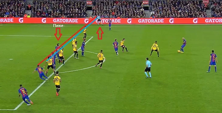 И если присмотреться по внимательней, проведя две параллельные линии, то становиться ясно, что и по голове и тем более по плечу полузащитник "Барселоны" находиться в офсайде. И лайнсмен со своего ракурса все это прекрасно видит.