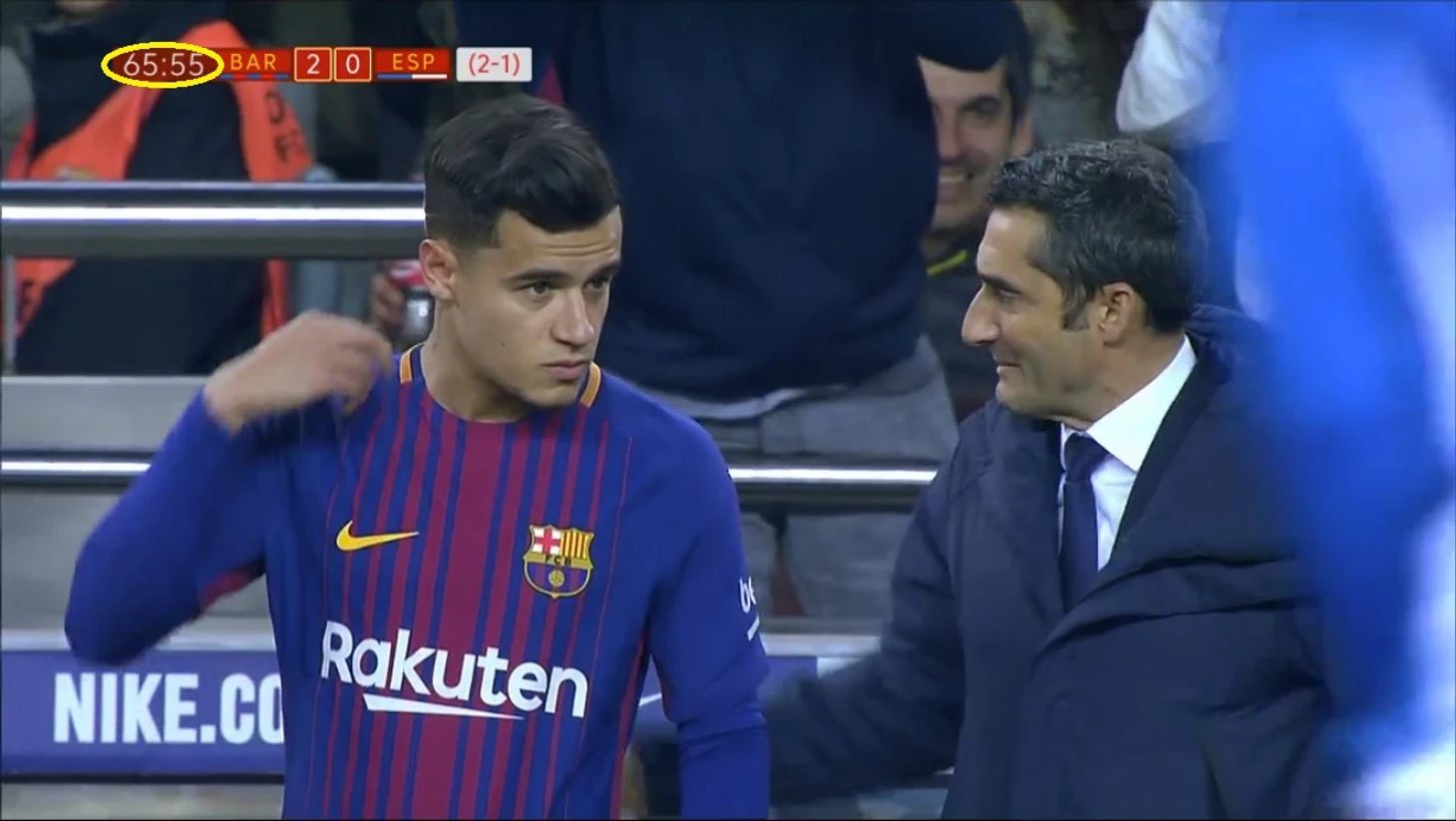 Филиппе Коутиньо получает последние указания у кромки поля от Эрнесто Вальверде.