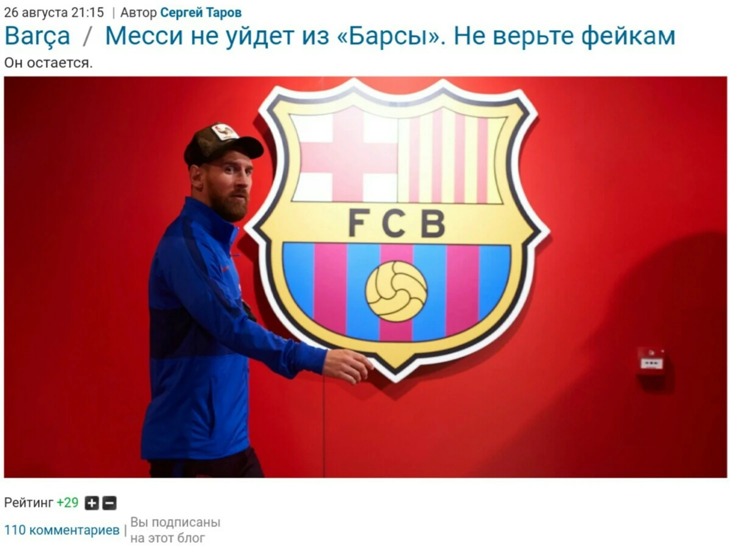 Как только в СМИ появилась информация о том, что уход Месси из "Барселоны" неизбежен, я опубликовал специальный пост, в котором объяснял, что на самом деле аргентинец никуда не уйдет и призывал болельщиков не поддаваться влиянию многочисленных слухов. Я на 100% был уверен, что Месси никуда не уйдет. Так оно и вышло.