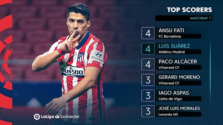 На данный момент "Атлетико" опережает "Барселону" в турнирной таблице на 4 очка. А Суарес находится на вершине списка бомбардиров и по системе "гол+пас" на 4 очка опережает Месси и Гризманна вместе взятых: Суарес - 4+1; Месси - 1+0; Гризманн - 0+0