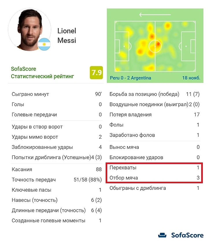 Ярким подтверждением данного тезиса стал последний поединок со сборной Перу, в котором Лионель Месси активно прессинговал на различных участках футбольного поля и сумел совершить в течении матча 1 перехват и 3 чистых отбора.