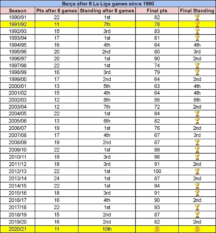 Это раз. Во-вторых, в новейшей истории "Барселоны" уже был подобный период, когда она набирала 11 очков за 8 стартовых матчей. Причем произошло это в эпоху знаменитой "Дрим Тим" Йохана Кройффа. "Барсу" называли тогда командой мечты, в составе которой блистали Куман, Гвардиола, Стоичков и прочие легендарные футболисты того времени.
