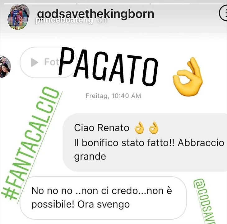 Одним из таких людей стал Ренато, который, скорее всего, ни на что не рассчитывал, но с досады написал Боатенгу сообщение с просьбой вернуть деньги, которые он потерял в связи с отъездом игрока в чемпионат Испании. Причем Ренато указал в своем сообщении номер банковского счета. Каково же было удивление болельщика, когда спустя несколько дней Боатенг возместил финансовые потери Ренато и заодно написал ему ответное сообщение: