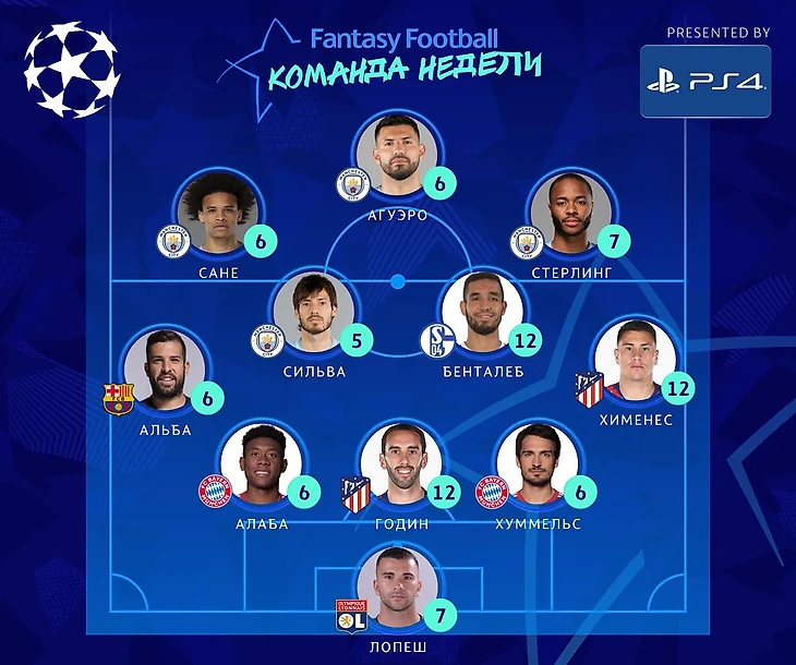 В команду недели вошли следующие игроки: Антони Лопеш («Лион»), Давид Алаба, Матс Хуммельс (оба — «Бавария»), Диего Годин, Хосе Хименес (оба — «Атлетико»), Жорди Альба («Барселона»), Набиль Бенталеб («Шальке»), Давид Сильва, Лерой Сане, Рахим Стерлинг, Серхио Агуэро (все — «Манчестер Сити»).