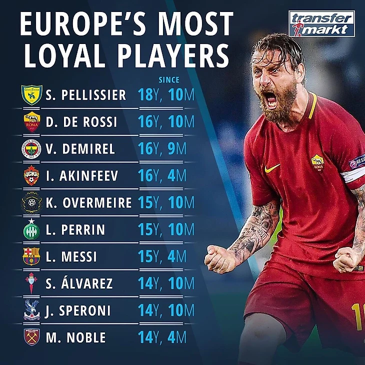 Портал Transfermarkt опубликовал список из десяти самых преданных своим клубам футболистов. В топ включены только ныне играющие спортсмены, поэтому в списке нет Мальдини, Тотти, Дель Пьеро, Джеррарда и других легендарных футболистов, известных своей преданностью клубам, но уже закончивших карьеру.