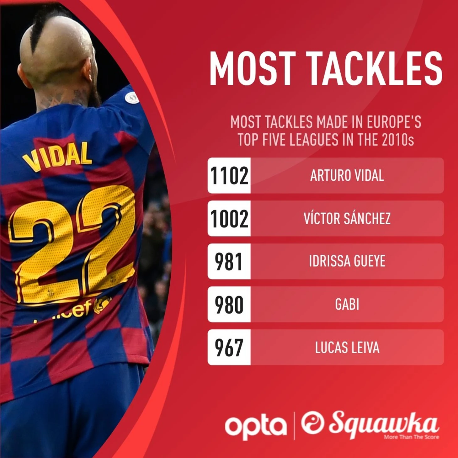 Полузащитник "Барселоны" Артуро Видаль в период с 2010 по 2019 год сделал в матчах топ пяти европейских чемпионатов 1102 отбора. Он лидирует по этому показателю.