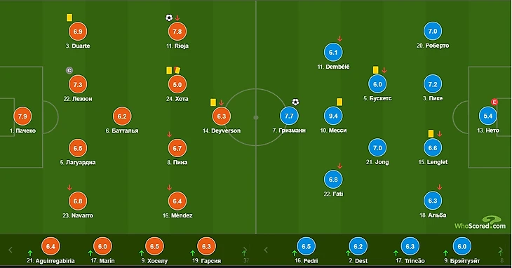 Из положительных моментов можно выделить лишь гол Антуана Гризманна, который не забивал уже довольно давно. Он получил оценку 7,7. Лучшим же стал Лионель Месси, у которого за матч стоят высокие 9,4, несмотря на то, что аргентинец не отметился результативными действиями.