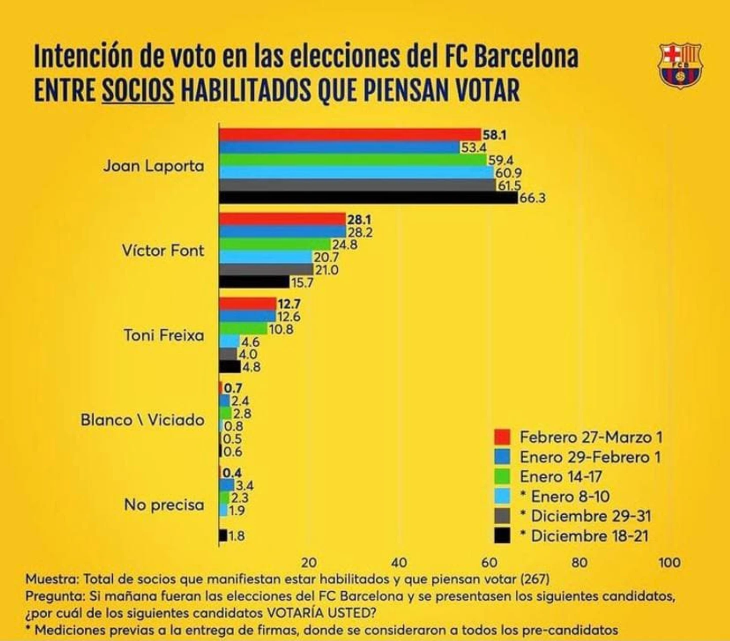 Впрочем, как видно на графике, уровень поддержки Лапорты снизился по сравнению с декабрем, но но все равно лидирует в гонке за голоса избирателей.