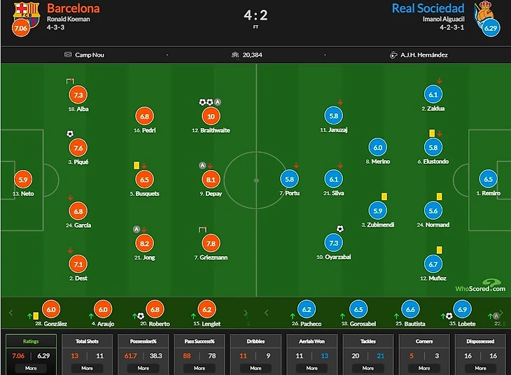 Напряженный матч между «Барселоной» и «Реал Сосьедад» завершился победой каталонцев 4-2. Можно отметить прекрасный дебют Мемфиса Депайя и его голевую передачу на Жерара Пике, открывшего счет на 19й минуте встречи. А также Мартина Брейтуэйта – неожиданного игрока в «основе» «Барселоны», забившего дубль и ставшего главным героем матча. Мартин получил максимально высокую оценку от портала