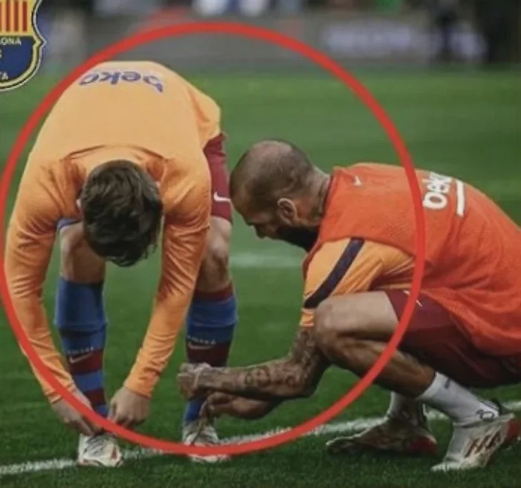 Фото дня: Дани Алвес помогает Гави завязать шнурки во время класико