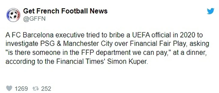 «По словам Саймона Купера из Financial Times, в 2020 году официальный представитель «Барселоны» пытался подкупить чиновника УЕФА, чтобы тот провел расследование в отношении «ПСЖ» и «Манчестер Сити» по поводу финансового фэйр-плей, спросив «есть ли кто-то в отделе FFP, которому мы можем заплатить».