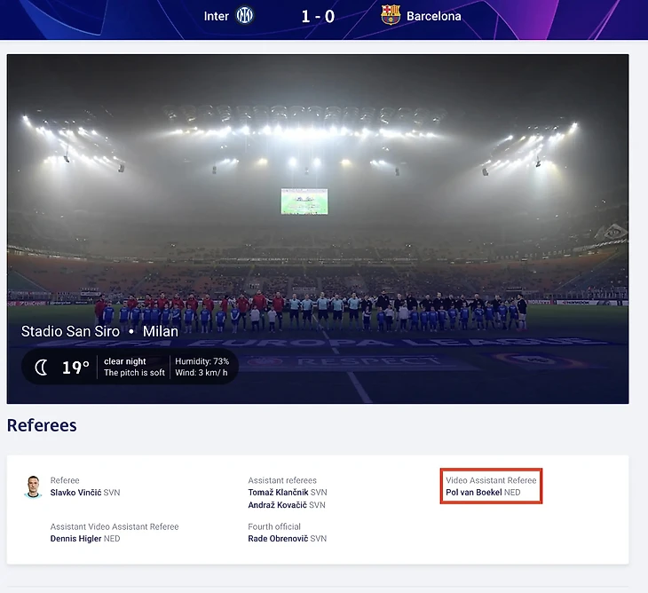 Голландский арбитр Пол ван Букель, который отвечал за VAR во время матча «Интера» и «Барселоны», попросил главного судью вмешаться в эпизод с потенциальным пенальти в матче Лиги Европы.