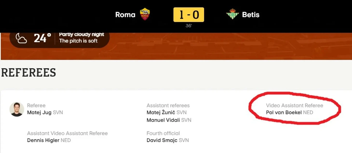«Бетис» встречался с «Ромой», ближе к концу первого тайма футболист испанской команды сыграл рукой в своей штрафной. Почти так же, как Дензел Думфрис в матче с «Барсой». Но только в игре ЛЕ судья решил назначить пенальти!