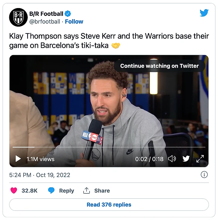 После победы над «Лос-Анджелес Лейкерс» в матче открытия НБА, игрок «Голден Стэйт Уорриорз» Клэй Томпсон рассказал, что главный тренер Стив Керр использовал «Барселону» в качестве примера, когда объяснял своей команде тактические передвижения на баскетбольной площадке.