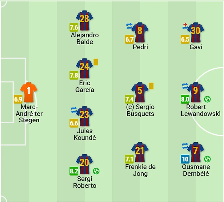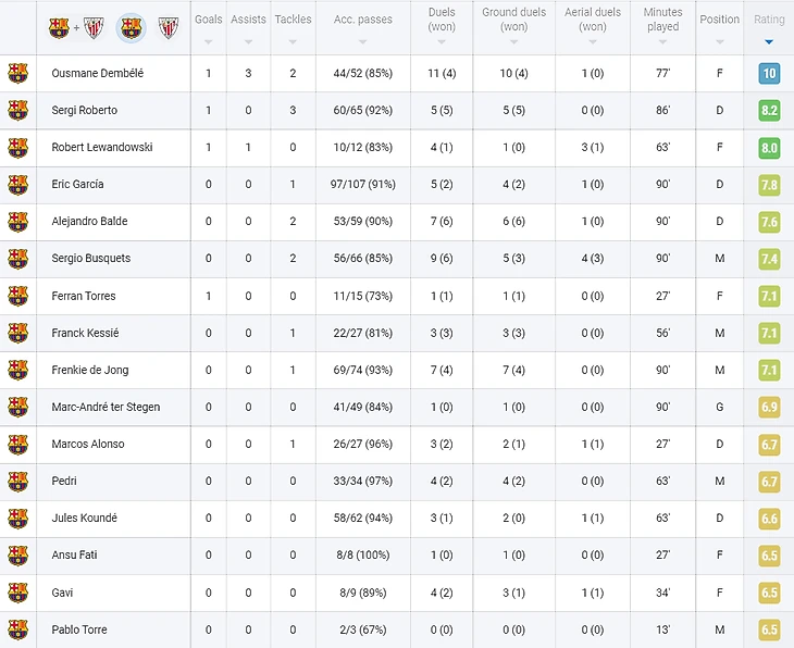 Лучшим игроком матча стал Усман Дембеле. Француз набрал потрясающую форму и сегодня поучаствовал во всех четырех голах своей команды. Причем «поучаствовал» − слабое слово, так как эти голы он создал. Сперва Усман открыл счет с передачи Левандовски, а затем мощно ассистировал Серджи Роберто, Левандовски и Феррану Торресу. В активе Дембеле сразу четыре ключевых паса и «десятка» от ресурса SofaScore.