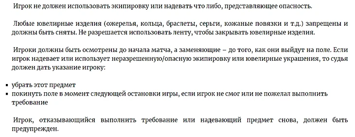 По правилам ФИФА, футболисты обязаны до начала игры снять с себя все кольца, серьги, ожерелья и цепочки. Это связано с тем, что ношение подобных предметов может быть травмоопасно как для тех, кто их носит, так и для остальных.