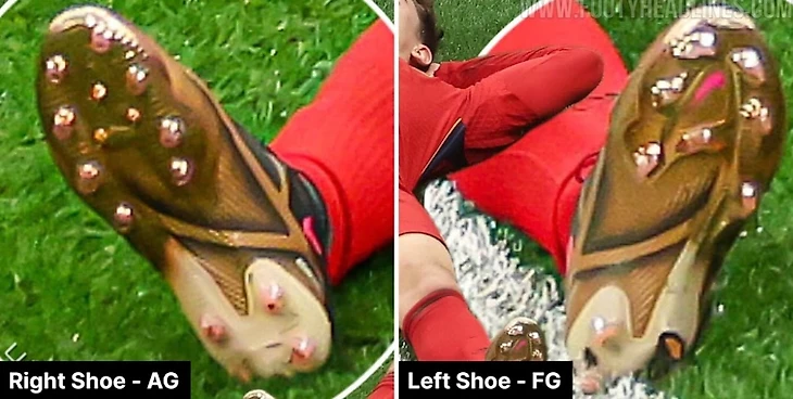 На правую ногу полузащитник «красной фурии» надевает обувь с подошвой для искусственной травы, а на левую – c подошвой для твердых покрытий и натурального газона.