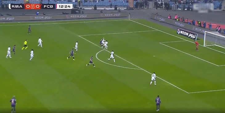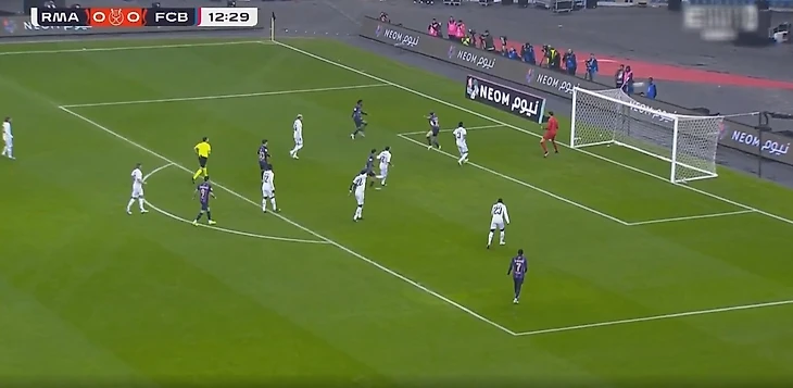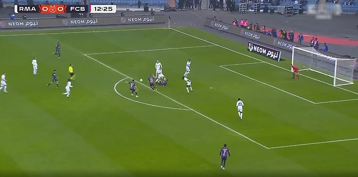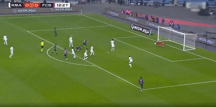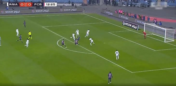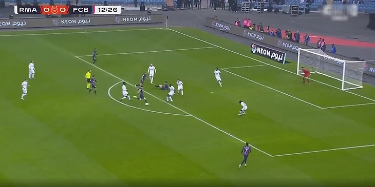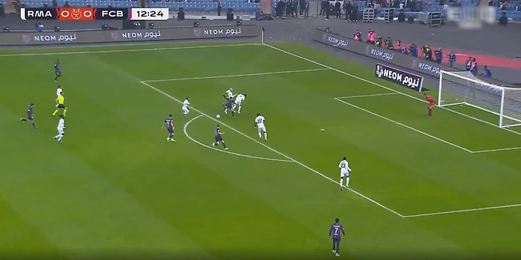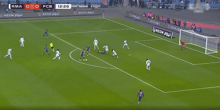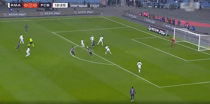 К нему кинулись сразу три игрока «Мадрида». Им не удалось выиграть единоборство, и в итоге Милитао пихнул его, выставив ногу, о которую Гави споткнулся и начал падать. В этот момент он успел отдать отличный пас на Левандовски, который стоял ровно напротив ворот.