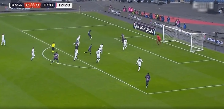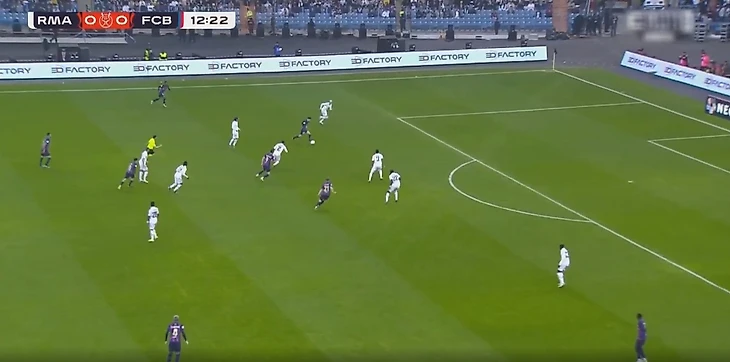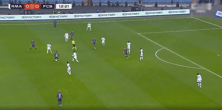 Левандовски отдал мяч Педри, а тот сделал пас в сторону штрафной. Гави рванул к мячу и начал тащить его в штрафную мадридцев.