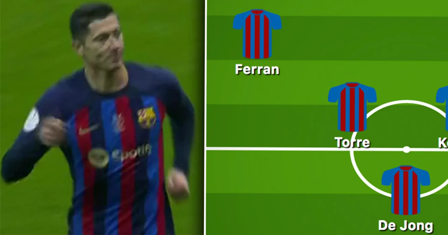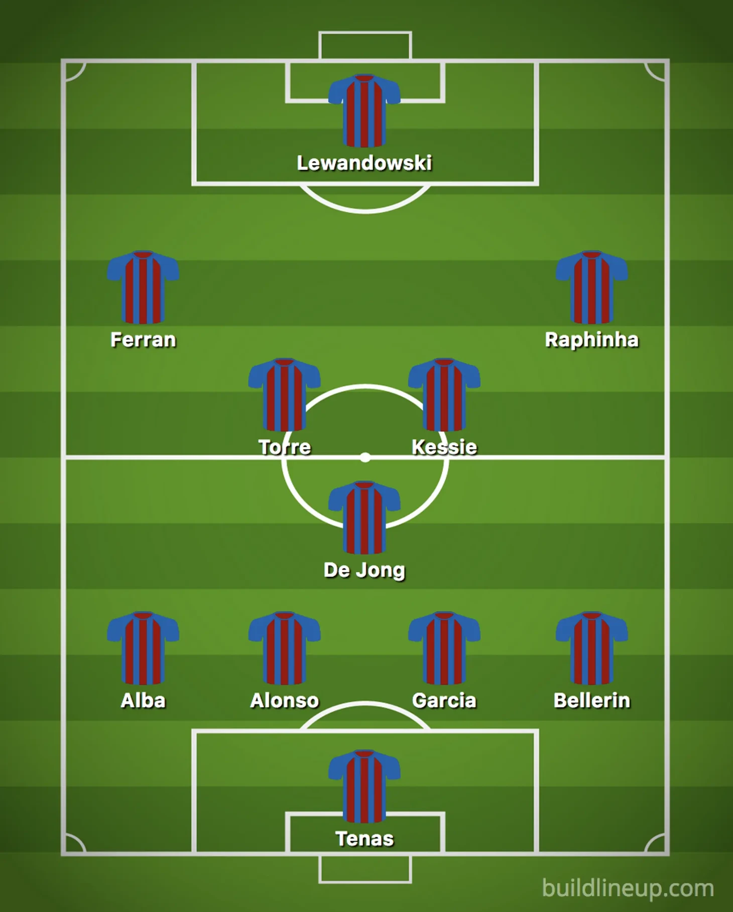Тенас; Бельерин, Гарсия, Алонсо, Альба; Кессиэ, Де Йонг, Торре; Рафинья, Левандовски, Ферран.