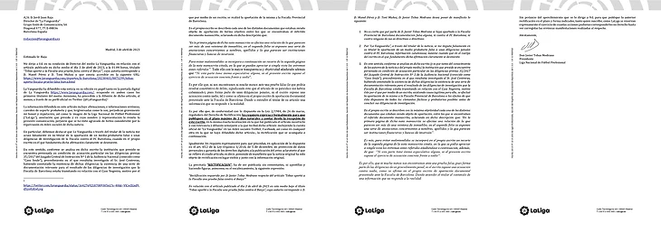 «До подачи документа в прокуратуру, юридическая консультация лиги 21 февраля проинформировала делегатскую комиссию о содержании брифа и его документов. Может стоит исправить полученную информацию, La Vanguardia?»