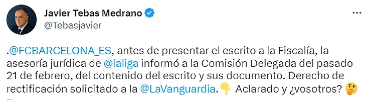 Также Тебас прикрепил официальное письмо, которое он отправил в адрес главного редактора издания, которое, на его взгляд, опубликовало фейковую информацию. Он дал три дня на исправление, в противном случае, дело отправится в суд.