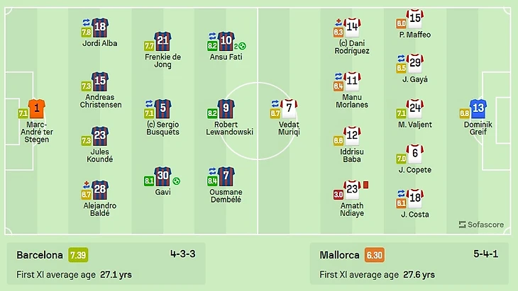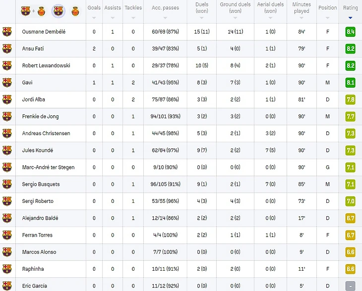 Хозяева уверенно разобрались с «Мальоркой» со счетом 3:0, а главным голеадором матча стал Ансу Фати, оформивший дубль. Гави тоже отличился голом + пасом, а у Дембеле и Левандовски по ассисту.