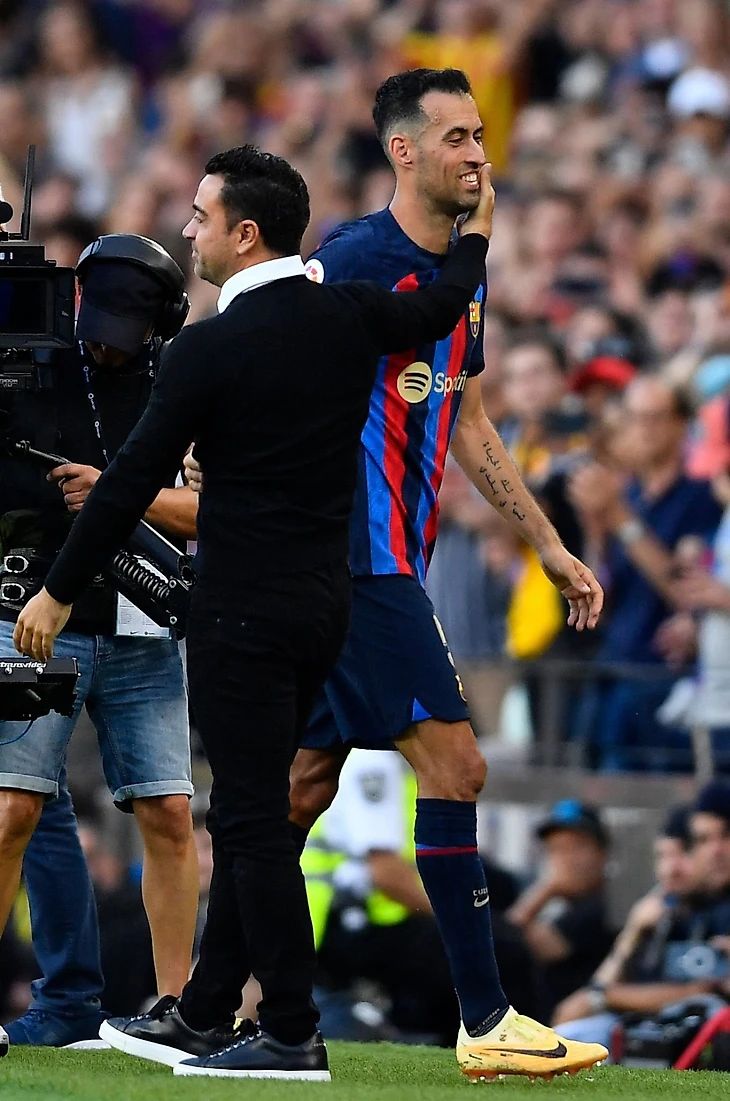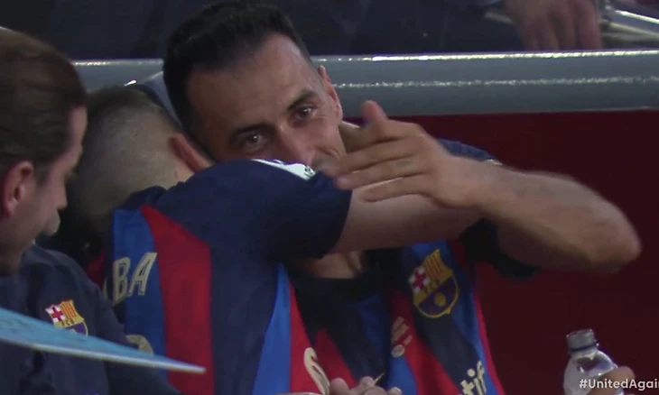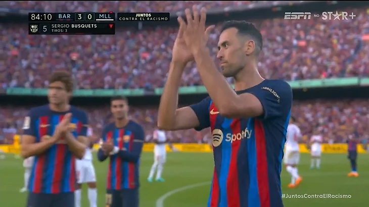 Через 5 минут настала очередь Бускетса. Он покидал поле с улыбкой, но под не менее громкие овации. Подойдя к кромке поля, полузащитник передал капитанскую повязку Серджи Роберто и обнялся с Хави.