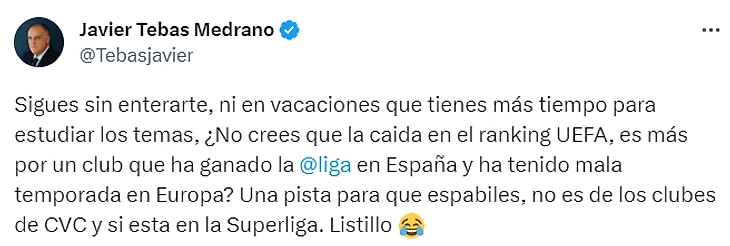 «Вы до сих пор не знаете, что падение Ла Лиги в рейтинге УЕФА больше связано с тем, что клуб, взявший титул, провел неудачный сезон в Европе? Подсказка для вас, что это клуб не связан с CVC и он поддерживает Суперлигу».