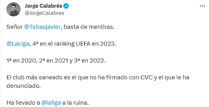 «Синьор Хавьер Тебас, хватит лжи. Ла Лига в сезоне-2022/23 заняла четвертое место в рейтинге УЕФА. В 2020 году мы были первыми, в 2021-м − вторыми, а в 2022-м − третьи. Самый здоровый клуб тот, который не подписал контракт с CVC, и тот, кто его осудил. Вы привели Ла Лигу к разорению».